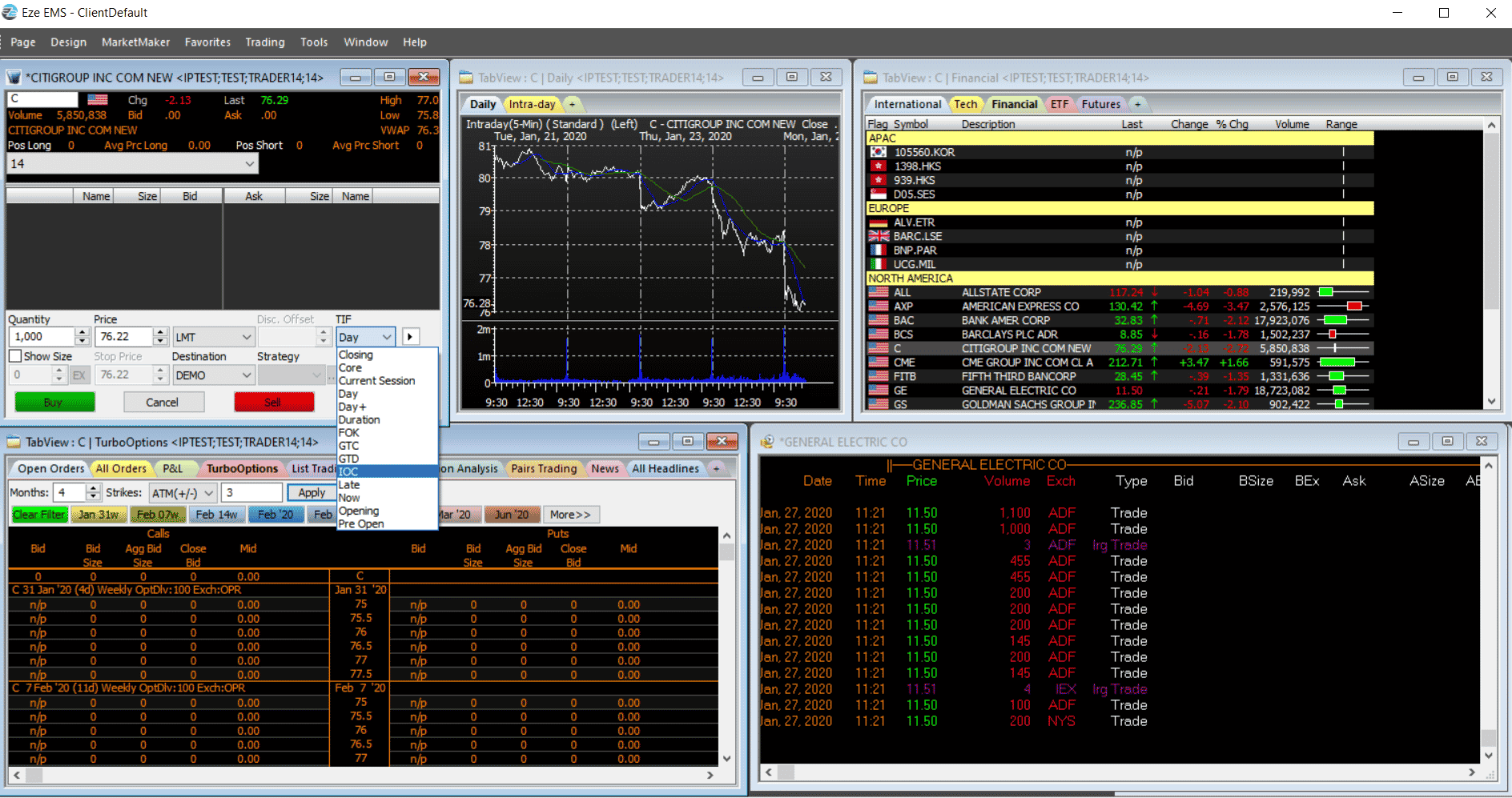 - Eze EMS (anciennement RealTick Pro) : pensée pour le trading sur contrats à terme, c’est la seule de la gamme à gérer ces actifs. Elle offre le streaming de données niveau II, des listes de surveillance, des raccourcis clavier, le routage direct et la saisie groupée d’ordres.
