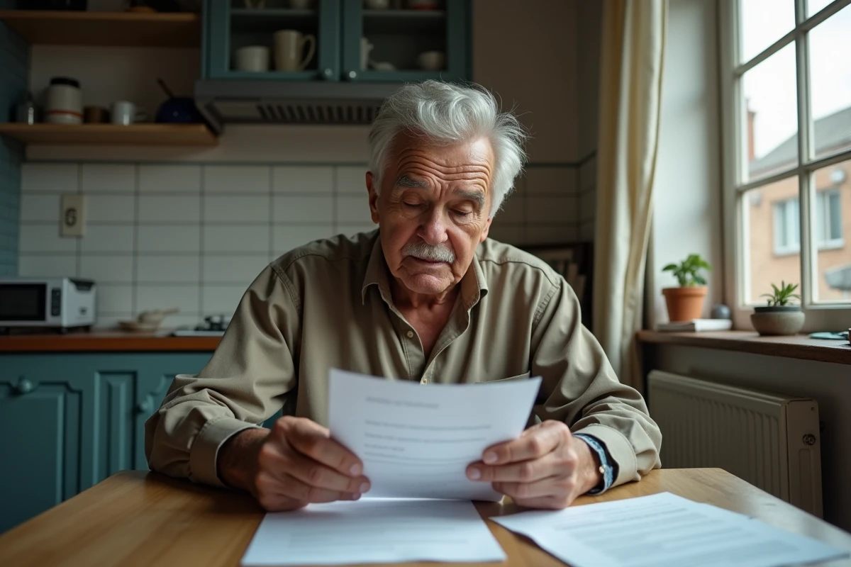 Homme âgé concentré sur des documents officiels dans sa cuisine